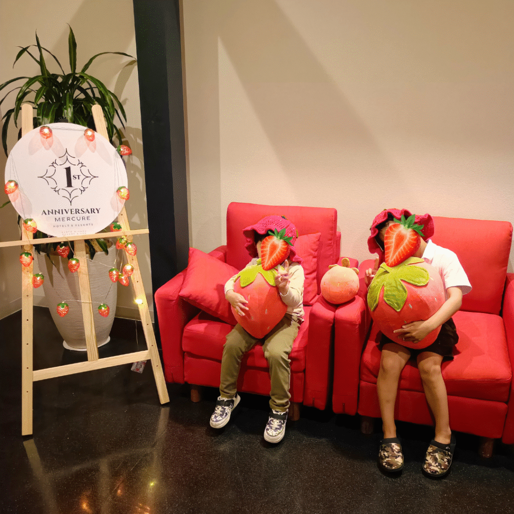 到着してまず感じたのは、海沿いに建つホテルの美しさ。ロビーにはイチゴのフォトスポットがあり、子どもたちもイチゴの帽子をかぶって楽しんでいました🍓
