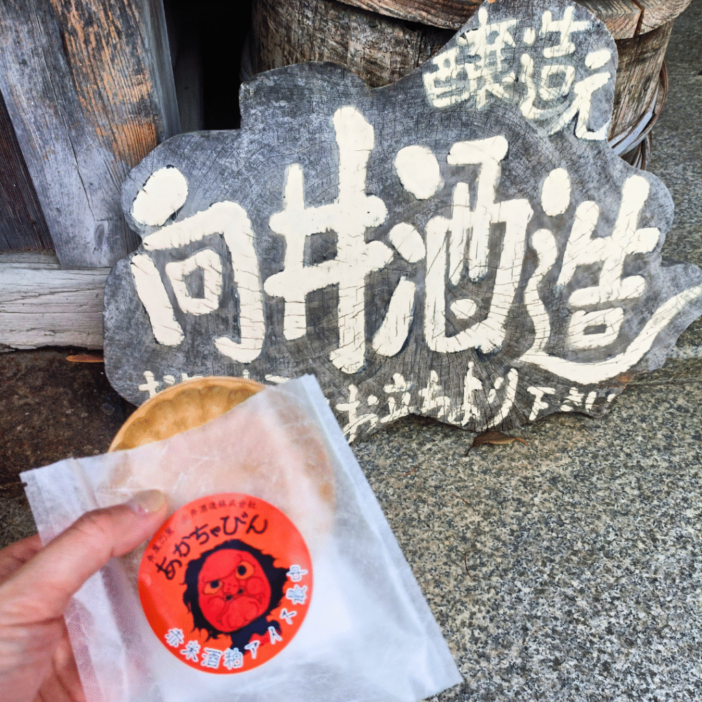 ここでは、お土産に日本酒と酒粕と酒ひしお(お醤油)、赤米のロールケーキを購入して、さらに駐車場までの食べ歩きように「あかちゃびん」と書いてある赤米酒粕アイス最中を購入しました。香りが豊かでとても美味しかったです!子供達と取り合いっ子しながら仲良くいただきました!